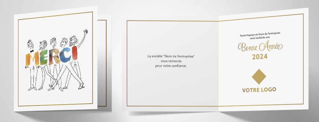 Entièrement personnalisée par nos soins, avec votre logo et votre texte, votre carte de vœux professionnelle en format papier vous est livrée en 2 jours pour : 180 € HT SEULEMENT (fabriquée en France).